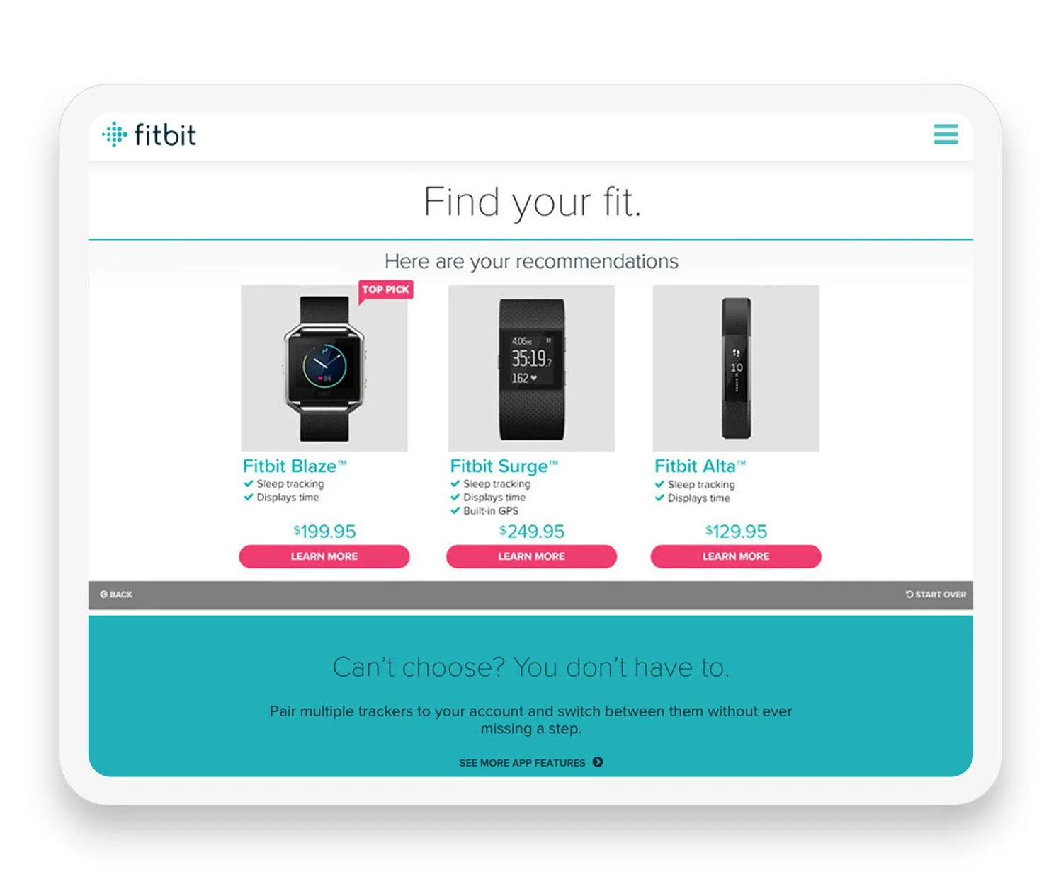 I created an interactive product finder for Fitbit’s website, to help customers quickly and easily find the product that would fit their specific needs.
