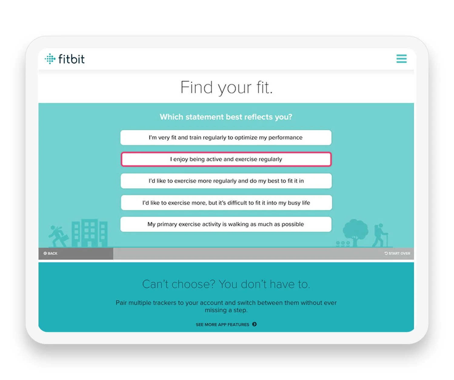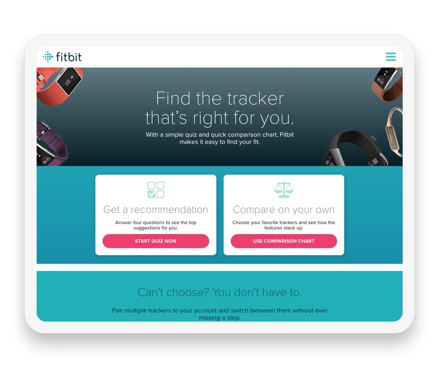 Following Google’s acquisition of Fitbit, this product recommendation quiz is unfortunately no longer live. But an archived page with the animated hero section, can be viewed here.